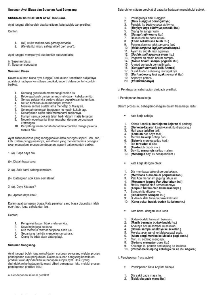 Latihan Ayat Songsang Tingkatan 3 - Ayat Susunan Biasa Dan Ayat Songsang Worksheet. Beg yang penuh dengan buku itu ada di atas meja. Soalan 3:tukarkan setiap ayat susunan biasa di bawah kepada ayat susunan songsang . Soalan 1:tukarkan setiap ayat susunan biasa di bawah kepada ayat susunan songsang tanpa mengubah maksud asalnya. Pada awal pagi, keadaan suhu di atas gunung kinabalu sungguh dingin. Tukarkan ayat bersusunan biasa yang bergaris kepada ayat bersusunan songsang tanpa mengubah maksud asalnya. Cuba latihan di bawah untuk meningkatkan kemahiran anda untuk memahirkan diri untuk menukarkan ayat biasa kepada ayat songsang. Ayat songsang apabila berlaku pendepanan predikat.